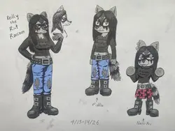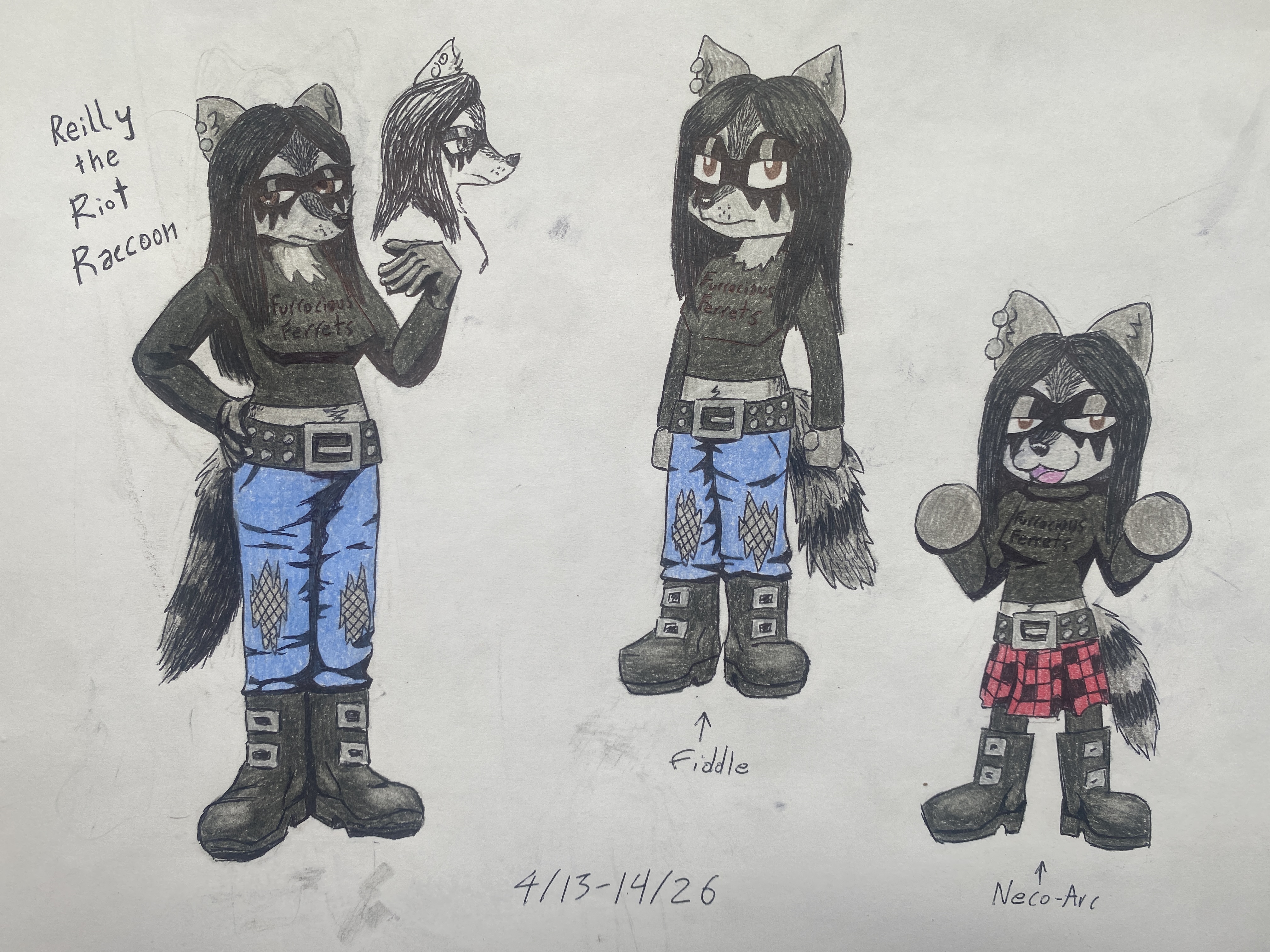 >Got some new drawings. Mostly wanted to experiment with species i usually dont draw. I mostly draw lupines and vulpines… I know, so cliche. Anyways, I came up with a new OC while doing so: Reilly the Riot Raccoon, a goth-punk raccoon girl and a Furrocious Ferrets fanatic.