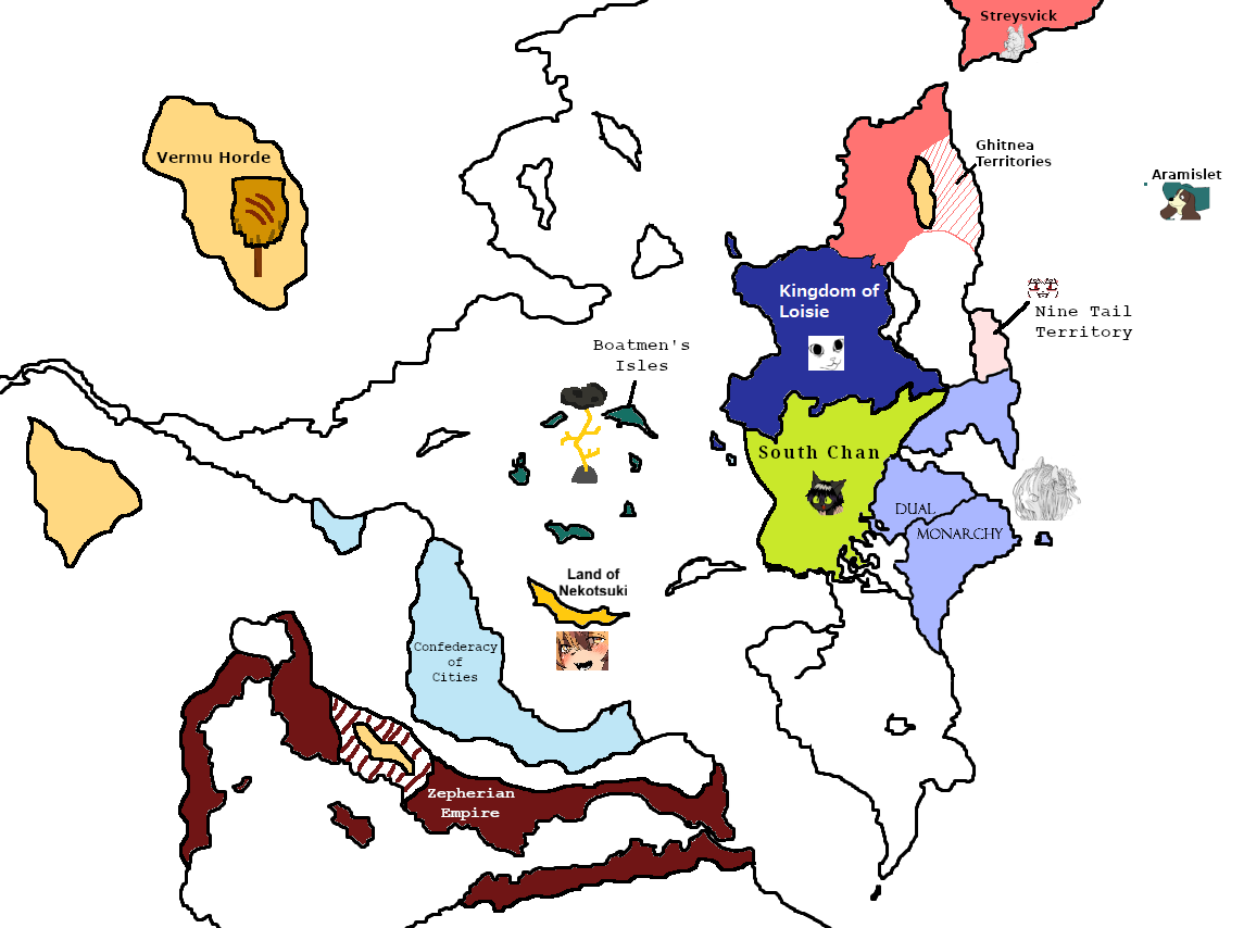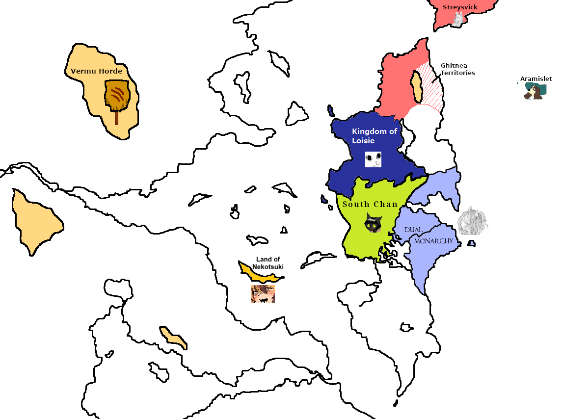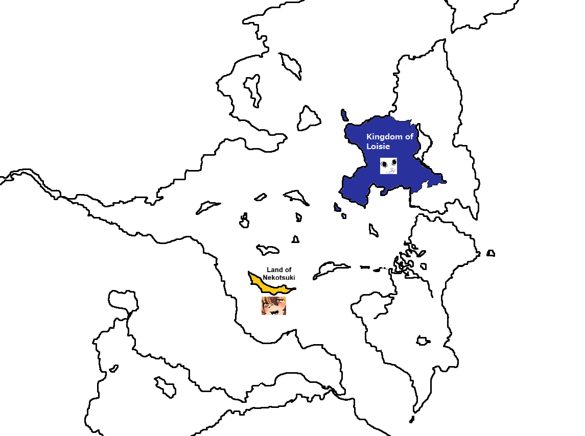 Yes, the Kingdom of Chan was a hekkin multicultrally diverse nation with white and black cats alike until bigoted extremists decided to seperate. Now that I think about this more, it would be more interesting to make South Chan a mostly mountainous area. They have a huge population, but very few fertile land, meanwhile North Chan or "Kingdom of Loisie" is lacking in industry but has lots of farmland and doesn't have a huge population issue but is growing rapidly. Food prices are high, and yet the government is sending billion of tons of grain to feed fureigners is putting a strain on the populace and may lead to unrest. They hope that the Land of Nekotsuki will be able to assist them in exchange fur cheap refined goods.