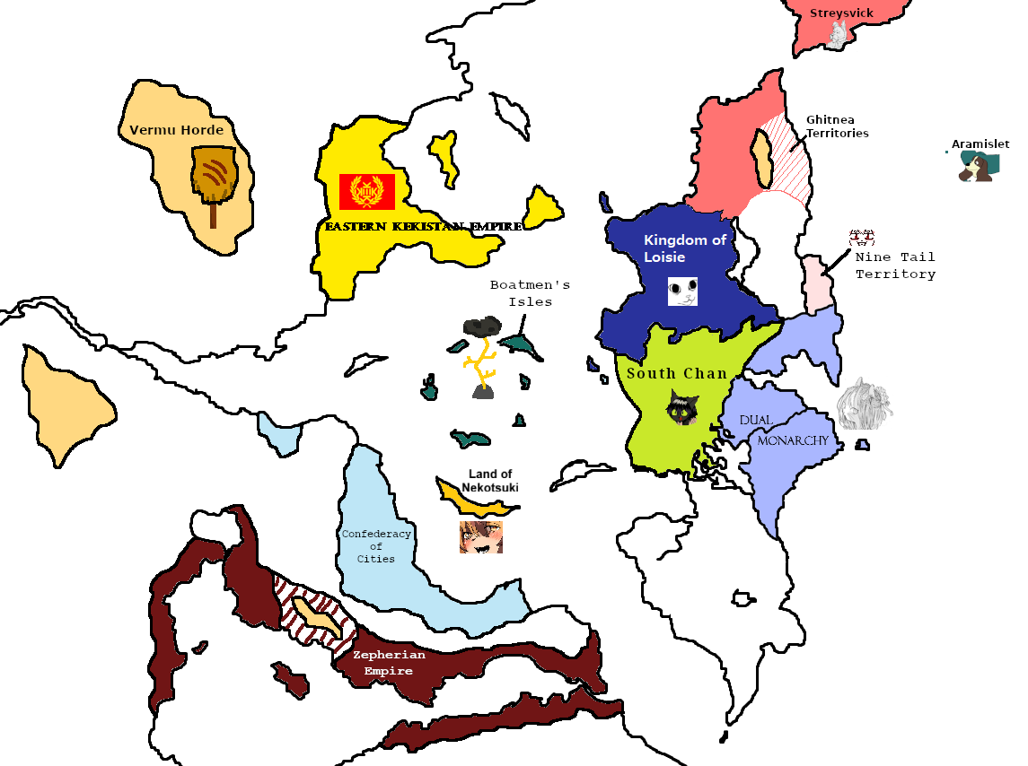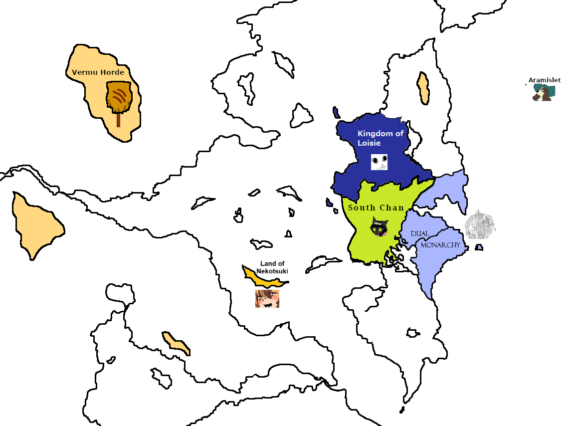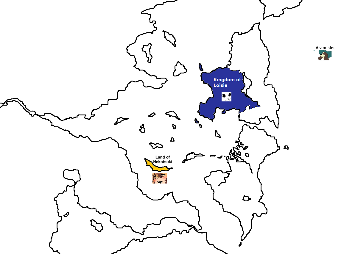 Pick a waifur of your choosing, and create a country based on the character. Take the image above you, and put in your changes. You can also make any changes to the landmasses as you see fit.
