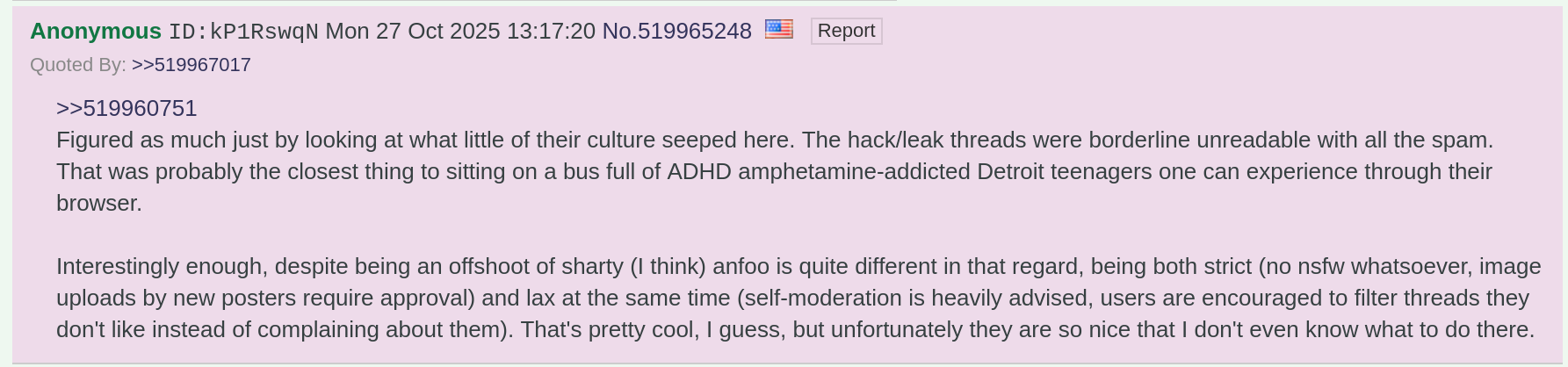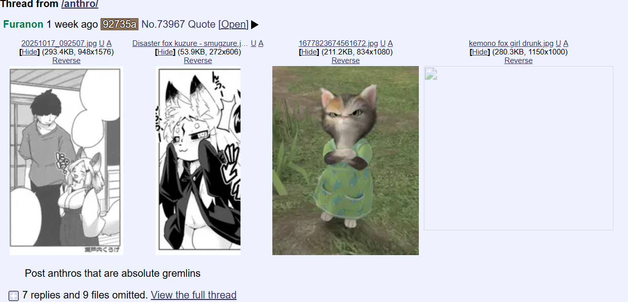 Main thing is I think we’d need more mods and it would blood let activity from /anthro/ and /b/. Also of course have to go down the list of fetishes and decided which ones are le good and le bad. I might support it if you seriously think it could be added without a problem and provide to the site. Maybe just elevate some people to board janny on just that board to deal with it.