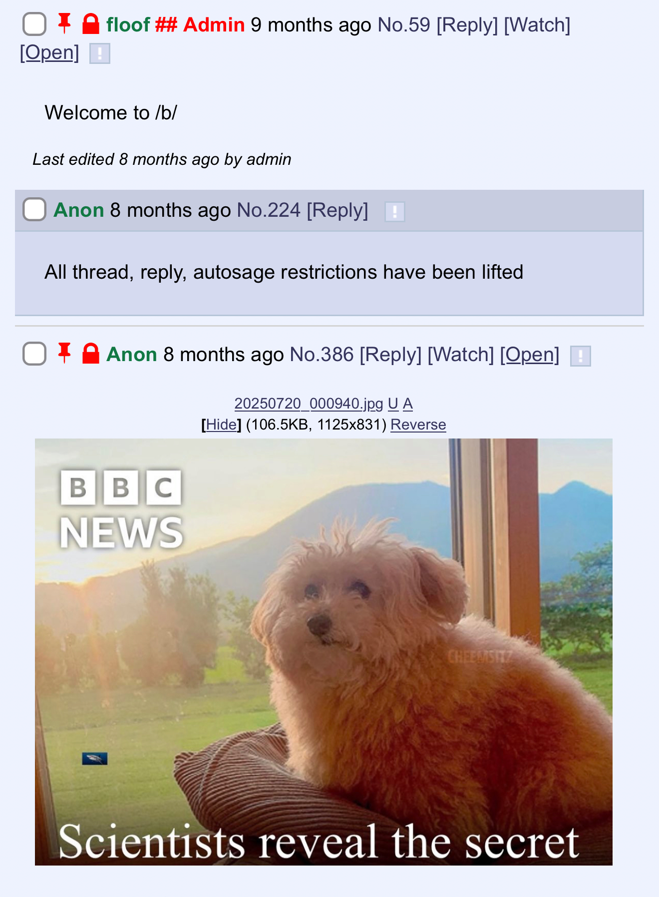 20 minutes from this post, I will deploy another important small update. I will continue do more maintenance, the next few updates will all be focused on the mod work flow. But I also have a few important updates planned for (You) the user: IDs will become optional per thread, flag alts (one flag can have multiple alt versions), and finally a rework to the account system.