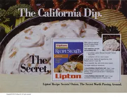And it was sold with recipes, because the marketing people thought people would buy more of it if you could use it for more than making soup.  My mom mixed it into hamburger patties, for example.  One of the most popular recipes, though, was one where you mixed the packet of instant soup into sour cream and let it stand a few hours in the fridge for the soup mix to absorb a bit of moisture from the sour cream.  Then you're supposed to put a little parsley on top and serve it with crackers or chips.  Lipton at first called it "California style onion dip" but it was eventually renamed "French onion dip" to cash in on that French food fad I mentioned.  It was yuge.  It was so yuge that soon they were selling it pre-made in plastic tubs in the dairy section.  It was pretty popular.  Maybe it wasn't quite as popular as ranch dressing is now, but they sold an awful lot of it.  They still do.
